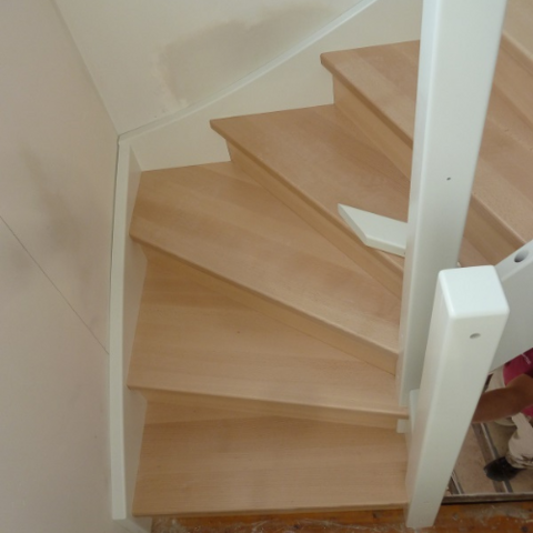 Jeder Arbeitsschritt beginnt von der untersten Stufe an. Es wird Maß genommen, dann beginnt der Zuschnitt. Die Stellstufe wird zugeschnitten und montiert, danach folgt die Trittstufe. Auch diese wird eingepasst und mit einem speziellen Treppenkleber absolut gerade montiert. So arbeiten wir uns Stufe für Stufe nach oben. Abhängig von dem vorhandenen oder dem gewünschten Bodenbelag gibt es bei der obersten, der letzten Stufe, die verschiedensten Möglichkeiten. Es kann eine Austrittstufe montiert werden, die nahtlos in einen Flur oder eine Podest Fläche mit dem gleichen Dekor übergehrt. Des Weiteren kann mit unterschiedlichen Profilen ein Abschluss gefunden oder ein Winkel aus vielen möglichen Materialien als Übergang montiert werden.