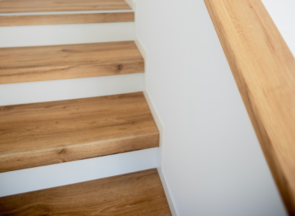 Laminat ist der Allrounder unter den Treppenbelägen. Es ist abriebfest (Klasse AC4/AC5), kratzfest und in nahezu jeder Holz- oder Steinoptik erhältlich. Ob Sie den Look von hellem Ahorn, dunklem Nussbaum oder moderner Betonoptik bevorzugen – mit Laminat haben Sie die größte Auswahl. Zudem ist es extrem pflegeleicht und hält jahrzehntelang.